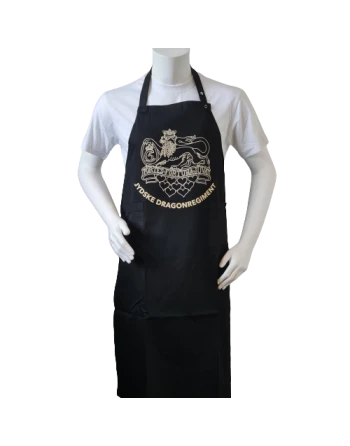 Justerbart kokkeforklæde i bomuld med 2 lommer, påtrykt Jydske Dragonregiments regimentsmærke.